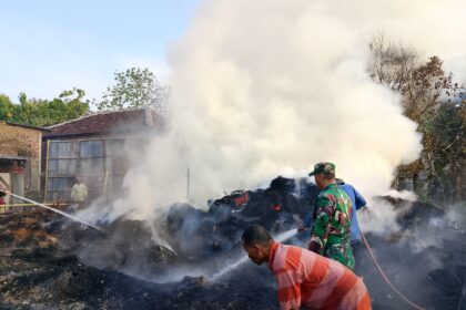 Weru, 25 September 2025 , Babinsa Desa Karangsari Serka Sucipto dari Ramil 0620-14/Weru melakukan monitoring sekaligus pengamanan atas kejadian kebakaran yang terjadi di Gudang Limbah Serut Rotan Owol...